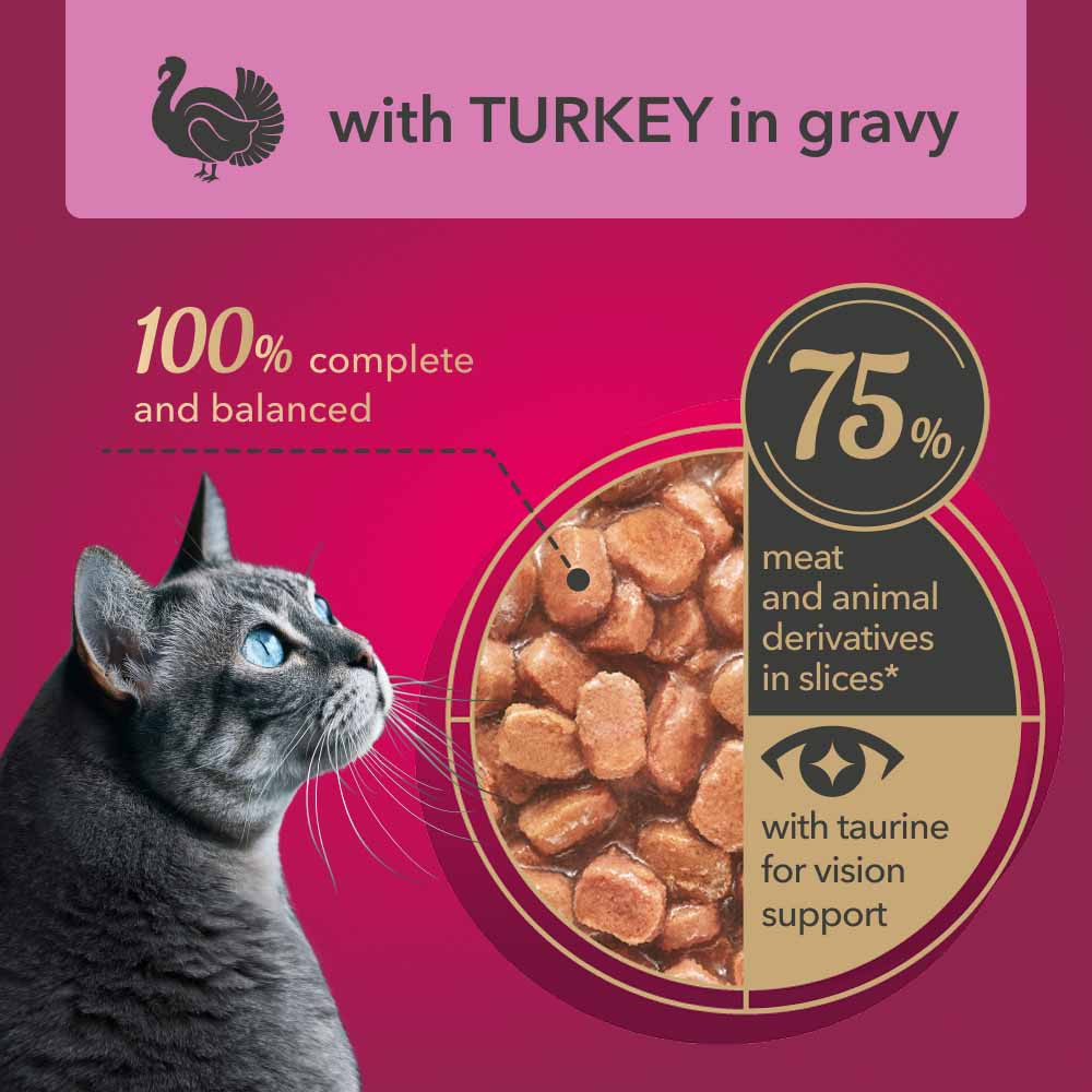 Összetétel: hús és állati melléktermékek (a hús és az állati melléktermékek legalább 76% -a szeletekben), beleértve legalább 4% pulykát, gabonaféléket (búza 6,45%), növényi fehérje kivonatokat, ásványi anyagokat, növényi eredetű származékot (petrezselyem) 0,001%.