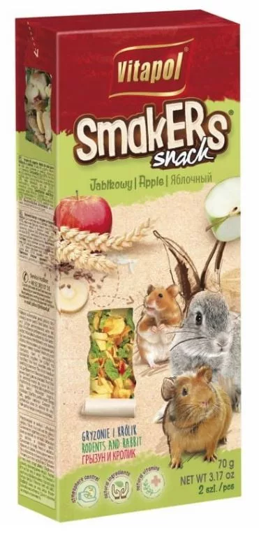 A Vitapol Smakers ideális étrend-kiegészítő rágcsálók és nyulak napi étrendjét kiegészíti. Ez egy tökéletes időbeli eltérítés és értékes étkezés. Csak tápanyagokban gazdag természetes összetevőket tartalmaz. A lombik fő összetevője egy szárított alma, amely gazdag C, B, A, E, K vitamin, élelmi rost, kvercetin, antioxidánsok és ásványi anyagok forrása. Tápértékének köszönhetően az alma segít csökkenteni a vér koleszterinszintjét, támogatja az immunrendszert és a fehérvérsejtek megfelelő működését. A káliumtartalom szabályozza az izomépítést és segít fenntartani azt normál állapotban. A magas C-vitamin-tartalom különösen fontos a tengerimalacok számára, mivel nem tudják szintetizálni azt.